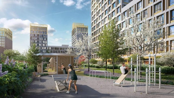 Для вашего досуга во дворе без машин выполнен ландшафтный дизайн с геопластикой, установлены детские и спортивные площадки, спроектированы места для отдыха, выполнено озеленение. На первых этажах расположены коммерческие помещения. Если вы владелец автомобиле, то для Вас предусмотрен подземный паркинг с бесконтактным доступом и системой распознавания номеров.